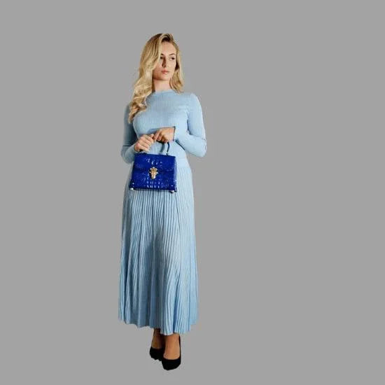 Robe mi-longue en soie de mûrier bleu marine à motif losanges